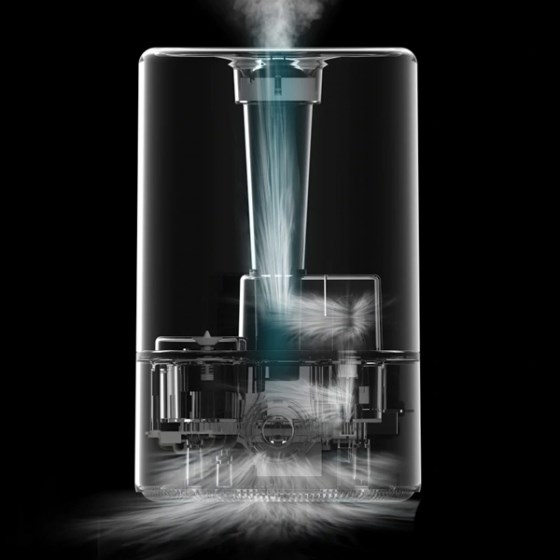 В увлажнителе Deerma F628 используется высокочастотные ультразвуковые волны для быстрого преобразования воды в мелкодисперсную взвесь, а турбовентилятор через внутренние каналы быстро выводит ее наружу, подавая в воздух до 350 мл воды в час.